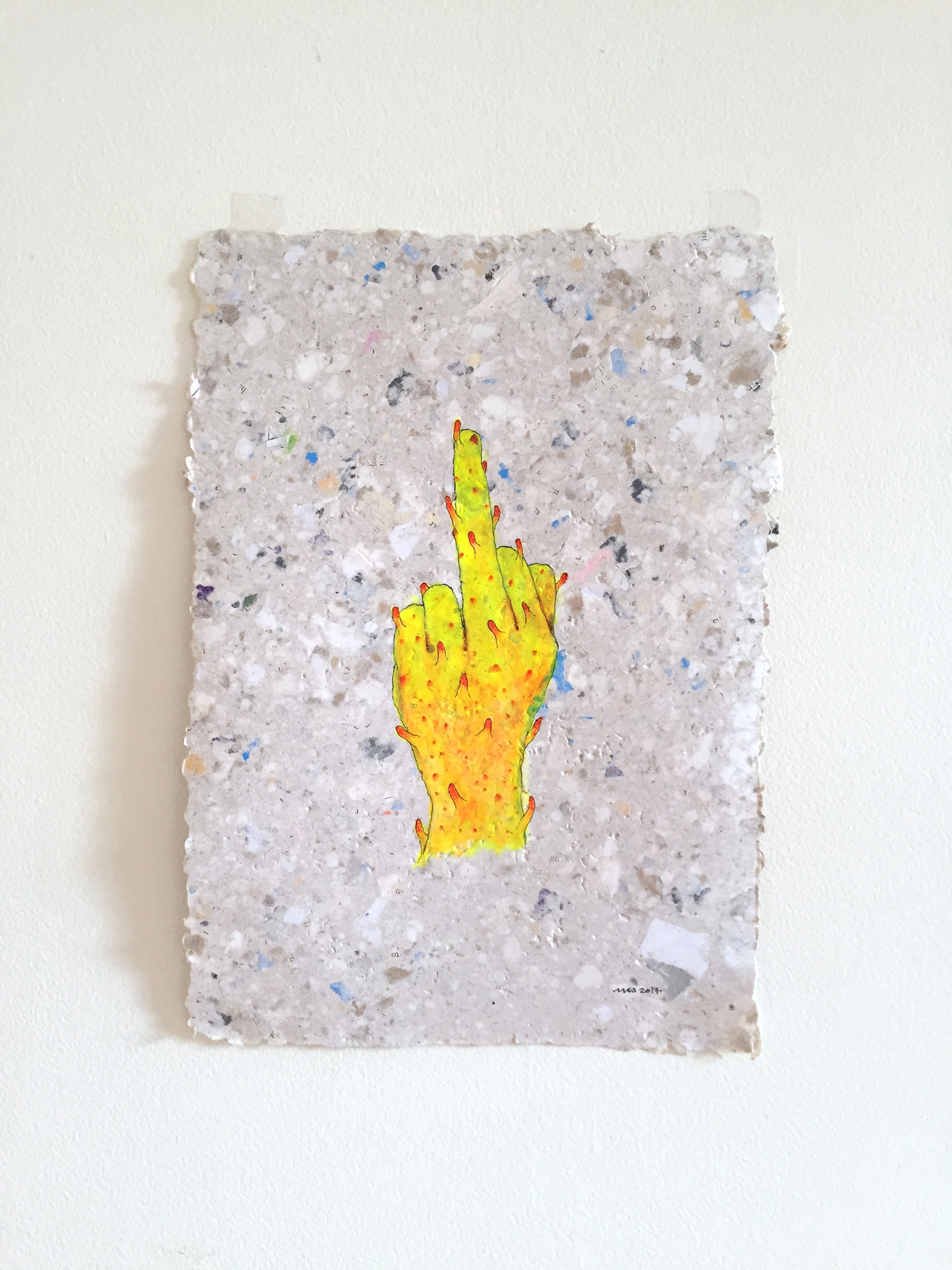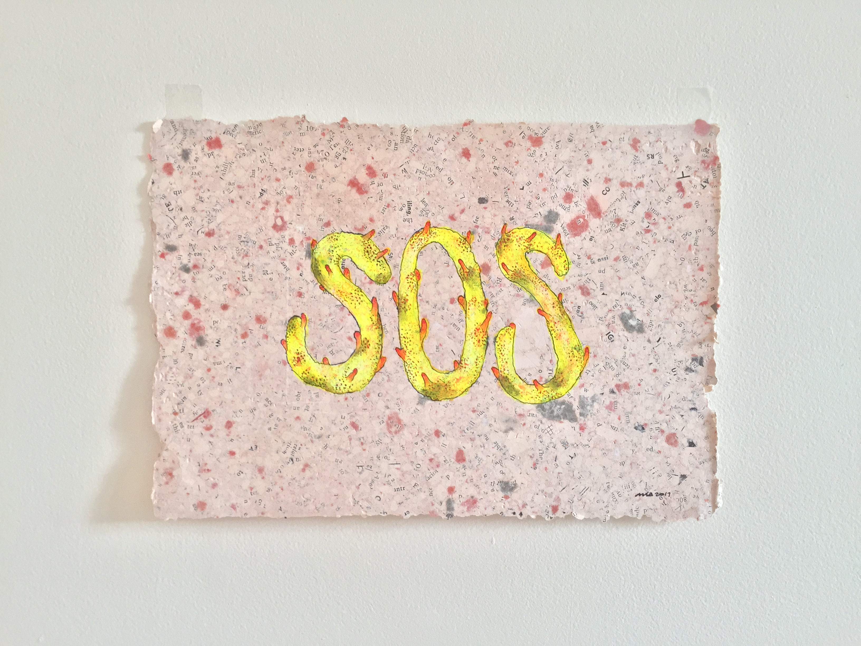 The above average ocean temperatures brought on by the El Niño causes mass coral deaths. Just before the corals die off it turns fluroecent yellow or green in its last attempt for survival. I created this series of drawings thinking about the fragility of our oceans.
